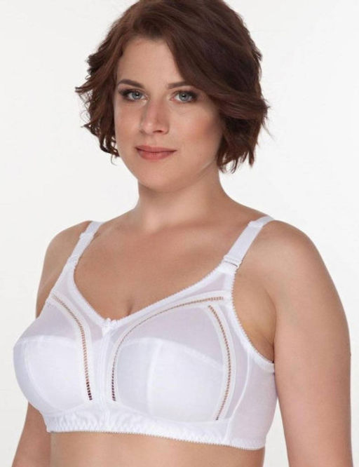 Бюстгальтер из неэластичного и эластичного трикотажных полотен. Без каркасов. Детали чашек на подкладке из тканого хлопкового полотна. Отделка тесьма с эффектом "мережки".