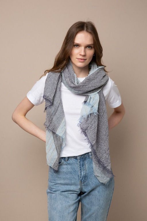 Стильный, модный меланжевый палантин из вискозы и хлопка с легким эффектом крэш декорирован нежной короткой бахромой ресничками по торцевым сторонам. Благодаря сочетанию полоски голубого цвета, и однотонного меланжево-синего цвета в стиле колор-блок красиво драпируется, придавая индивидуальности и уникальности своей обладательнице. Такой универсальный аксессуар необходимая часть гардероба, позволяющая подчеркнуть стиль, имидж и даже настроение женщины. Он подойдет практически к любому весеннему или летнему образу и сделает его более выразительным, стильным и ярким. Такой аксессуар является универсальным и гармонично впишется как в стиль спорт-шик, так и в стиль Casual, и в более раскрепощенный молодежный стиль. Его можно носить как головной убор, использовать как украшение для волос, носить на шее, и даже на отдыхе в качестве парео. Вы будете выглядеть стильно и ярко, используя в своем образе палантин от Модных историй.