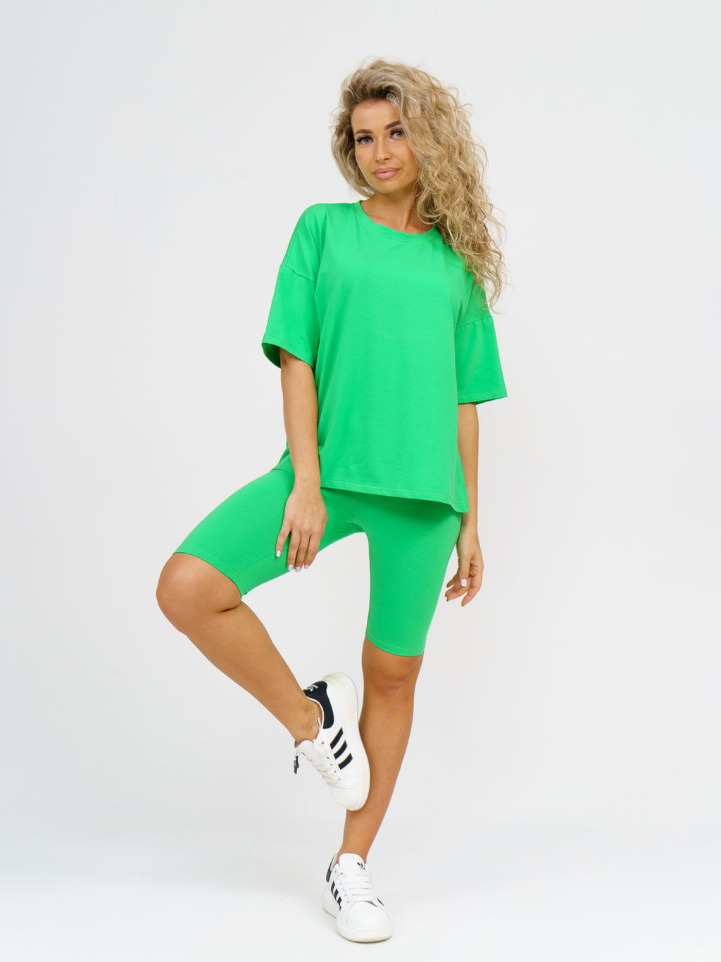 Стильный женский костюм двойка в стиле спорт-шик идеальное сочетание комфорта, уюта и модного дизайна. Этот трикотажный комплект состоит из длинной футболки оверсайз с модным принтом на спине и облегающих шорт-велосипедок, которые вместе создают гармоничный и женственный образ. Футболка свободного кроя с коротким рукавом  идеально сочетается с велосипедками на эластичной резинке, которые мягко облегают фигуру, подчеркивая все преимущества силуэта. Высококачественное трикотажное полотно приятно к телу, обеспечивает комфорт и тепло в прохладную погоду, оставаясь легким и дышащим в теплое время года это действительно универсальный комплект, для которого смена сезонов не имеет значения.