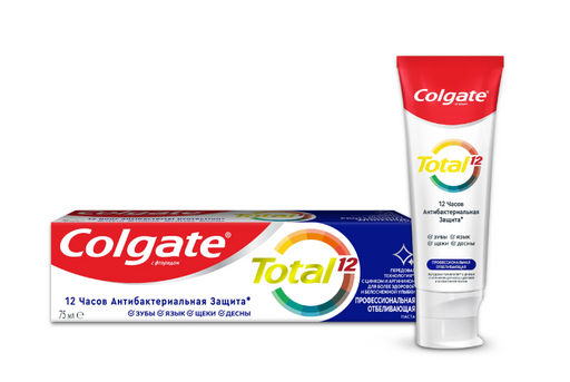 Зубная паста Colgate Total 12 Профессиональная чистка. Содержит передовую формулу с полезными минералами. Цинк борется с патогенной флорой, создавая защитный барьер, а аргинин ослабляет структуру зубного налета и улучшает проникновение других веществ. Снижает количество микроорганизмов не только на зубах, но и на языке, щеках и деснах. Ежедневно обеспечивает превосходную защиту от налета, признаков воспаления десен при борьбе с бактериями, нейтрализацию неприятного запаха изо рта, защиту от разрушения эмали, повышенной чувствительности, кариеса, камня, потемнений на эмали и проблем с деснами.