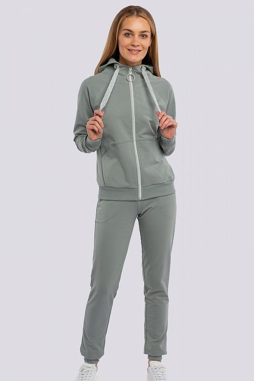 Каждая девушка мечтает выглядеть привлекательно в любой ситуации. Выглядеть стильно и красиво можно в самом обычном спортивном костюме. Главное найти костюм, подчеркивающий ваше хорошее чувство вкуса и индивидуальность. Незаменимый вариант для занятий фитнесом, активным отдыхом или в поездках, для прогулки и неофициальных мероприятий в городе. Толстовка на молнии с карманами для мелочей и небольшим капюшоном. Швы отстрочены декоративной строчкой серебристыми нитками. Брюки слегка зауженные книзу и заканчиваются манжетами. Оригинальные строчки серебристыми нитками добавляют женственности. Состав трикотажа: 75% хлопок, 20% полиэстер, 5% спандекс.­