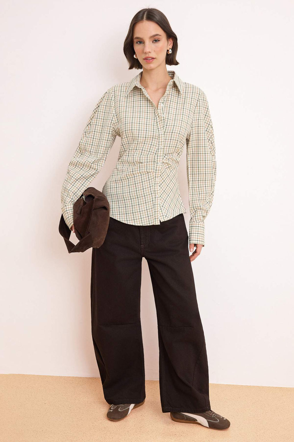 • Yesil Ekoseli Balon Kol Detayl? Bele Oturan Asimetrik Kapama Dokuma Gomlek TWOSS26GO00068