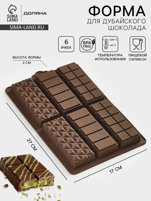 • Форма для дубайского шоколада Доляна «Квадраты, полосы, пирамиды», 6 плиток, 27.5×17×2 см, силикон, коричневая