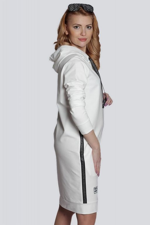 Стильное спортивное женское платье из трикотажа, как нельзя лучше подходит для повседневной носки, не сковывает движений. Платье с капюшоном имеет свободный силуэт и модную длину. В боковых швах модели спрятаны карманы. Бока декорированы лампасами. Изделие выполнено из качественного трикотажа \"двунитка\", приятного к телу и практичного в эксплуатации. Состав трикотажа: 75% хлопок, 20% полиэстер, 5% спандекс.