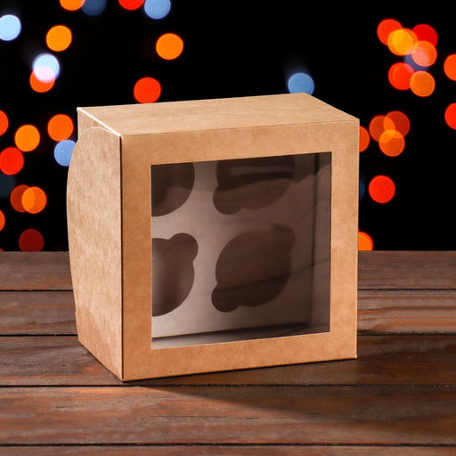 • Цена за 5 шт. Коробка на 4 мини - капкейка крафт с окном, 13×13×8 см