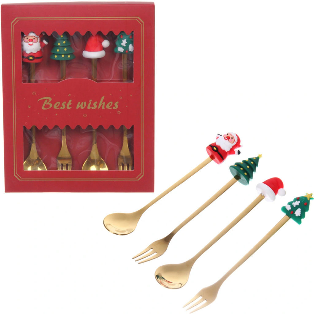 Набор для десерта "Дед Мороз и Ёлка" 4предмета (2ложки+2вилки) в подарочной коробке,золото­