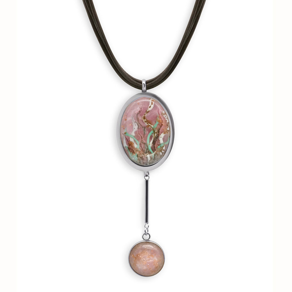 Колье изготовлено из натуральной кожи, муранского стекла и гипоаллергенной ювелирной стали, что очень важно для людей с чувствительной кожей. Металл не темнеет и не подвергается воздействиям окружающей среды, надолго обеспечивая красивый внешний вид изделия. Длина колье - 46 см + 5 см. удлиняющая цепочка. Длина кулона - 10 см. Размер стеклянного элемента - 4х3 см и диаметр 2 см. Вес -  27 гр.­
