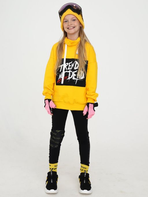 Толстовка с капюшоном свободного силуэта для девочки. На передней части нашивка. Плечо спущенное, рукав длинный с манжетой. Капюшон с имитацией маски, с контрастной средней частью. По низу пояс. Состав:92% хлопок, 8% лайкра