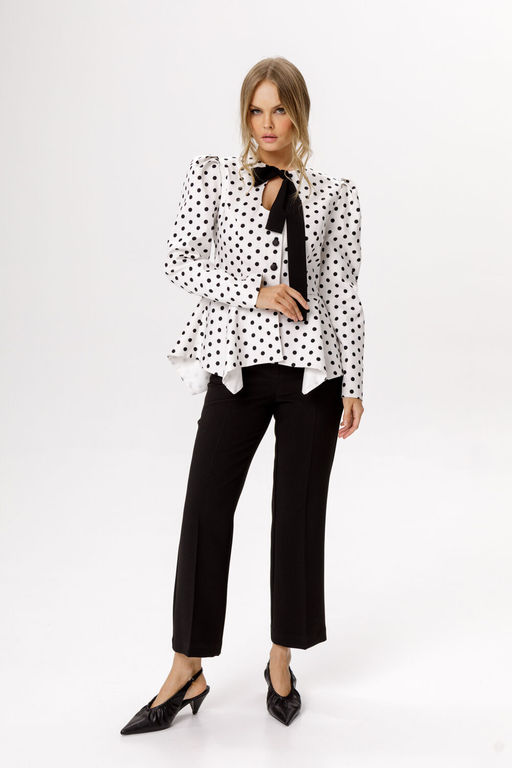 Состав: Жакет: Спандекс-3%; Хлопок-97%; Подкладка: Хлопок-100%; Брюки: Вискоза-32%; ПЭ-65%; Спандекс-3%; Комплект-двойка из хлопкового жакета в горохи с вырезом-каплей и укороченных брюк клёш со стрелками. Детали: жакет полуприлегающего силуэта, фигурный вырез-капля по переду и контрастный воротник-бант, отрезная линия талии, рельефы, втачные рукава со складками по окату, застежка на петли и пуговицы, жакет на подкладке 100% хлопок. Брюки клёш с притачным поясом со шлёвками, передние половины с заутюженными стрелками, застёжка на молнию и потайной крючок, наклонные карманы в боковых швах, задние половины брюк с вытачками и заутюженными стрелками. Пояс брюк без резинки. Длина жакета по спинке около 60 в размерах 40-46, около 62,5 см в размерах 48-52, длина рукава около 64 см. Длина брюк по боковому шву с поясом около 96 см в размерах 40-46 и около 98 см в размерах 48-52. Длина по внутреннему шву около 67 см -- Характеристики -- Состав: Жакет- Спандекс-3%; Хлопок-97%; Подкладка- Хлопок-100%; Брюки- Вискоза-32%; ПЭ-65%; Спандекс-3%; Сезон: Весна Рост: 164 Страна бренда: Беларусь