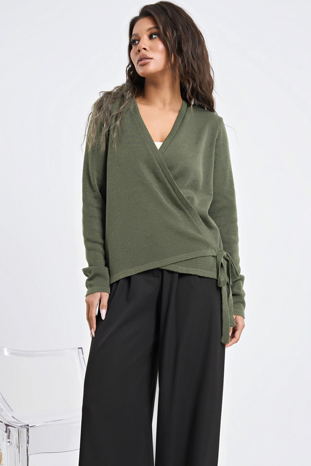 Особенности: Вязаный кардиган прямого силуэта  с запахом. Выполнен из полушерстяной пряжи. Полки кардигана фиксируются на завязках.