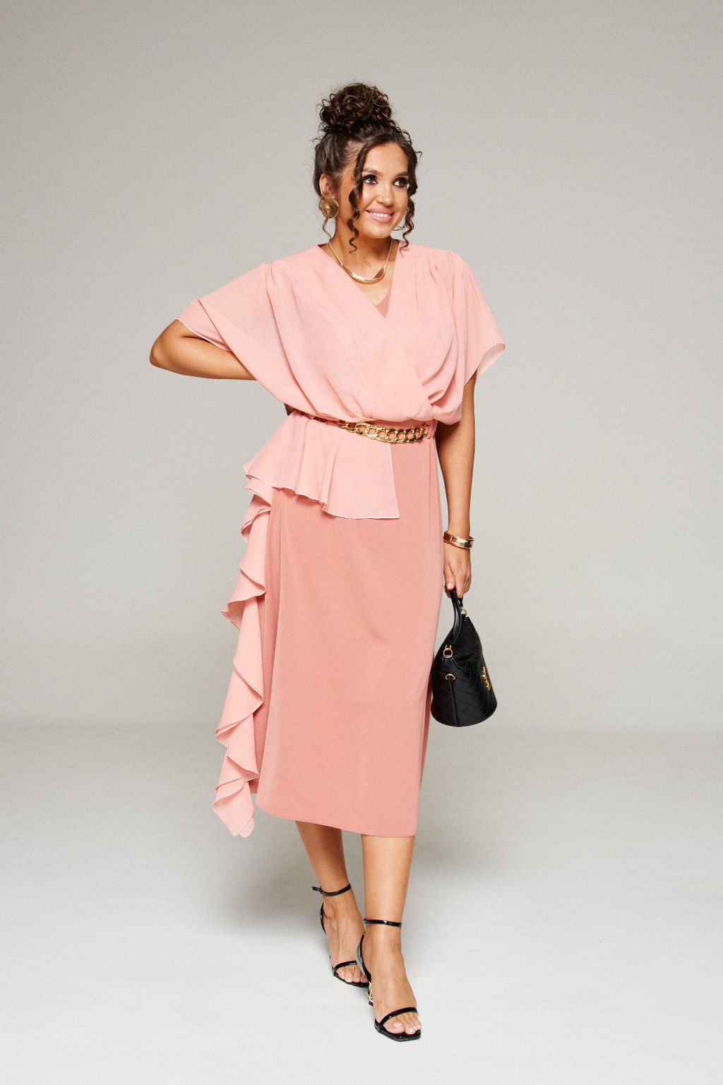Платье женское в нарядно-романтическом стиле, отрезное по линии талии и декорированное отделочным элементом под золото, выполнено из комбинации двух тканей: лёгкого струящегося шифона и смесового полотна. У этой ткани нежная, гладко-бархатистая фактура, приятная на ощупь и матовая поверхность, она легко драпируется и очень выгодно и дорого подчеркивает неповторимость образа, а шифон дополняет изысканностью и придаёт индивидуальность.