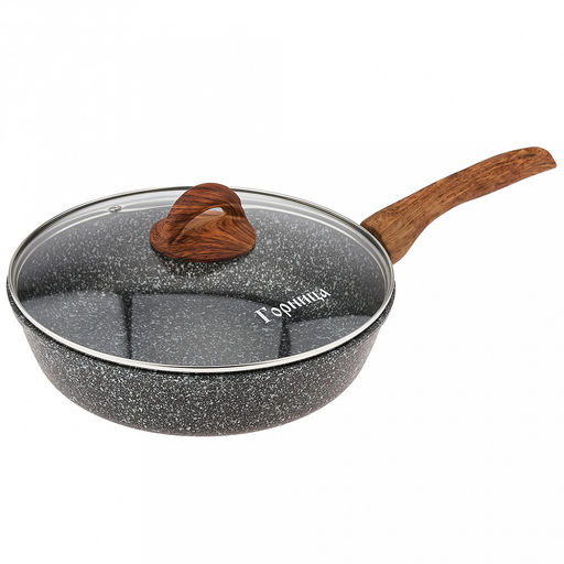 • Сковорода с тефлоновым покрытием д26см "Гармония", h7см, стеклянная крышка с пароотводом, пластмассовая ручка с покрытием "soft-touch" под дерево, "Мрамор", подарочная упаковка (Россия)