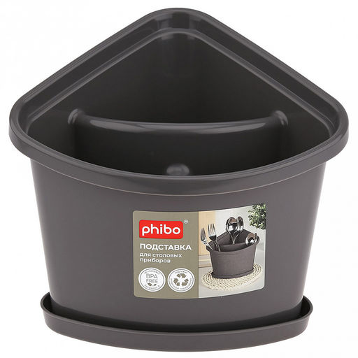 Подставка для столовых приборов пластмассовая 17,6х15х15,1см, 3-х секционная, с поддоном, серый, Phibo (Россия)