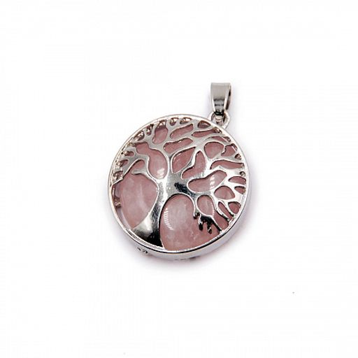 Подвеска талисман круглая Дерево Жизни с натуральным камнем розовый халцедон. Оправа - медицинская сталь.