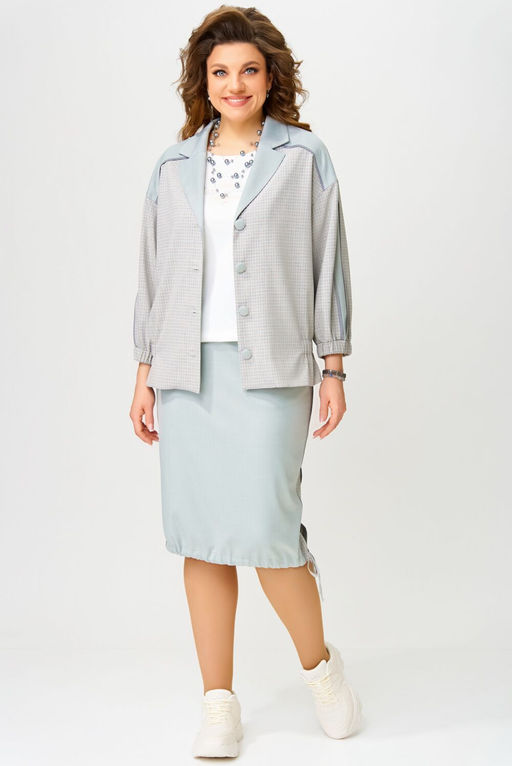 Состав: Жакет: Вискоза-70%; ПЭ-30%; Топ: Вискоза-95%; Эластан-5%; Юбка: Вискоза-70%; ПЭ-30%; Комплект тройка ""Бояна"" состоит из бомбера, юбки и майки-топа. Бомбер без подкладки, прямого силуэта, со спущенным рукавом. Застежка в бомбере на петли и пуговицы, воротник отложной с лацканами. По полочке - кокетка, в шов в кокетке вставлен кант, рукав 7/8, по низу рукава - резинка. По рукаву вставлено два отделочных канта, по спинке - притачная кокетка. В шов кокетки вставлен кант. По низу изделия по бокам вставлена резинка, низ бомбера обработан швом в подгибку с открытым срезом. Юбка выполнена из текстильной ткани на подкладке, прямого силуэта, по бокам вставлены лампасы, в швы вставлены декоративные канты. Верх юбки обработан поясом, по бокам вставлены резинки. По спинке в среднем шве вставлена потайная молния, по поясу застежка на петли и пуговицу. В боковых швах юбки разрезы, низ юбки обработан швом в подгибку с открытым срезом. В подгибку вставлен шнур-резинка. Майка-топ БОЯНА выполнена из вискозной трикотажной ткани, прямого силуэта, горловина обработана планкой, на полочке декоративная печать. Низ изделия и рукава подшиты на распошивалку. Замеры 50-58: ПОЛУОБХВАТ ГРУДИ (бомбер) 56 58 60 62 64 ПОЛУОБХВАТ БЕДЕР бомбера (по резинке) 54 56 58 60 62 ДЛИНА ИЗДЕЛИЯ (бомбер) 62 62 62 62 62 ДЛИНА РУКАВА (бомбер) 7/8 7/8 7/8 7/8 7/8 ПОЛУОБХВАТ БЕДЕР (юбка) 55 57 59 61 64 ПОЯС ЮБКИ 39 41 43 45 48 ПОЯС ЮБКИ в растянутом виде 46 48 50 52 55 ДЛИНА ЮБКИ 64 64 64 64 64 ПОЛУОБХВАТ ГРУДИ (топ) 55 55 57 59 62 ТОП по низу изделия 58 60 62 64 67 ДЛИНА ТОПА от плеча 62 63 63 63 64 -- Характеристики -- Состав: Жакет- Вискоза-70%; ПЭ-30%; Топ- Вискоза-95%; Эластан-5%; Юбка- Вискоза-70%; ПЭ-30%; Сезон: Весна Рост: 170 Страна бренда: Беларусь