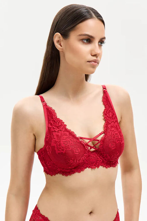 Бюстгальтер модели Soft bra with wire с мягкими чашками, на каркасах, с боковыми корсетными вставками, выполнен из нежного кружева вишневого цвета с дубляжом из сетки. Переднюю часть лифа украшают стрепы с колечками в цвет изделия. Широкие кружевные бретели в передней части лифа переходят в регулируемые бретели на спинке. Ширина бретелей во всех размерах 10 мм.Застежка на 2 крючка и 3 ряда петель.
