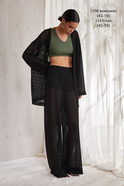 Костюм, состоящий из брюк и кардигана. Кардиган прямого силуэта, длиной до бедер. Изделие без застежки и без воротника. Спущенная линия плеча. Свободный длинный рукав, немного расширенный книзу. Спинка прямая. Изделие без подкладки. Пояс идет в комлекте. Брюки прямые, свободного кроя. Брюки на резинке (без застежки). Карманы в боковых швах .В брюках есть подкладка в виде коротких шортиков. Состав:Пэ 65
