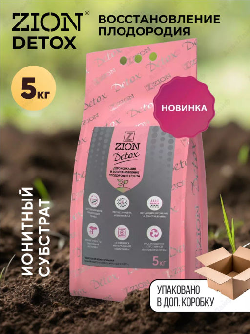 Эффективен для обеднённых, деградированных, песчаных и истощённых почв. Патент РФ No2662772. ЦИОН ДЕТОКС на основе цеолита, экологически безопасен, не содержит нитратов, ускорителей роста или фитогормонов. Исключает передозировку и корневой ожог, заменяя все остальные удобрения.