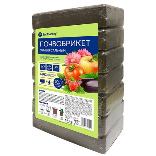 Обезвоженный и спрессованный в брикет питательный грунт для садово-огородных и декоративных культур. В отличие от традиционной формы, почвобрикет меньше по весу и объему его легче довезти к вам домой или на дачный участок.
