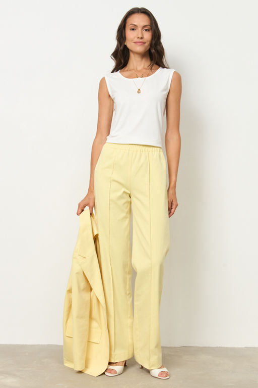 Брюки из хлопковой ткани прямого силуэта. Пояс притачной с эластичной резиной. На передней части брюк застрочены стрелки.