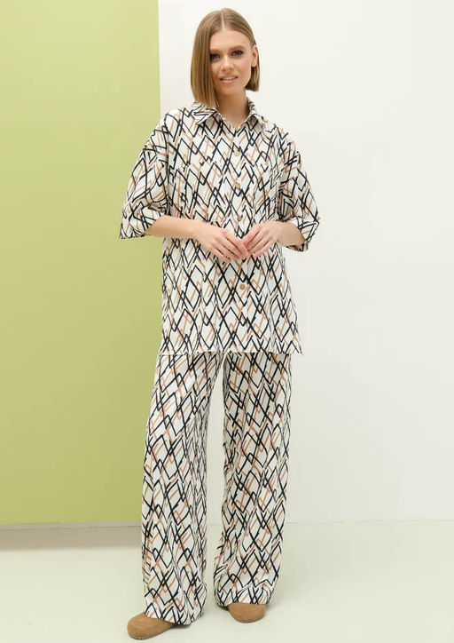 Костюм состоящий из блузы и брюк. Блуза свободного силуэта с центральной застежкой на петли-пуговицы. Перед с двумя накладными карманами. Спинка без среднего шва. Боковые швы заканчиваются разрезами. Рукав втачной одношовный короткий со спущенным плечевым швом. Воротник стояче-отложной на отрезной стойке. Брюки широкие свободного силуэта на притачном поясе с резинкой и втянутым в него поясом. На передних половинках расположены 2 боковых кармана.