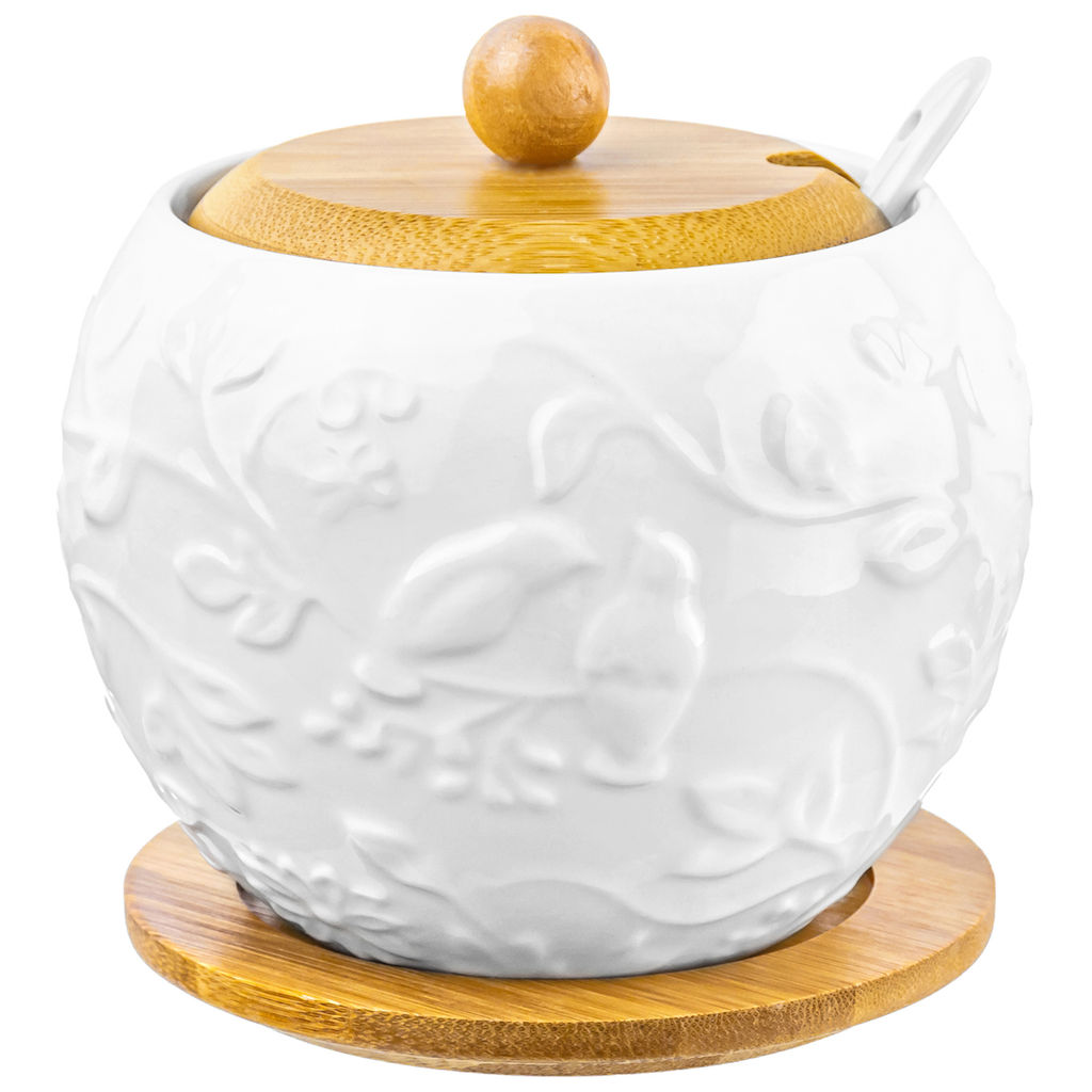 • Сахарница 620 мл 12*12*12 см "Птички на ветке" с ложкой и дерев. крышкой на дерев. подставке