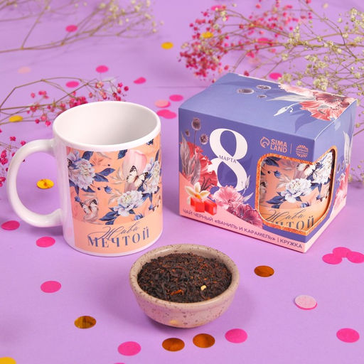 Чай чёрный «Ваниль и карамель», ароматизированный, 50 г Состав: чай чёрный байховый, ароматизаторы пищевые.Масса нетто: 50 г.Срок годности: 36 месяцев.КружкаОбъем: 300 мл.Состав: керамика.Срок службы: 5 лет. Набор: Да. Для кого: Для девочки. Для кого: Для женщины. В наборе, шт.: 2. Вес нетто, г: 50. Объём, мл: 300. Фасовка: Весовой. Вид чая: Чёрный. Тематика: Цветочно-растительная. Вид упаковки: Подарочная коробка. Рисунок: Да. Тематика праздника: 8 Марта. Адресат: Женщине. Возраст: Любой. Дополнительный аксессуар: Без аксессуаров. Вкус: Ваниль. Вкус: Карамель. Подарочный чай: Да. Составляющие набора: Чай. Составляющие набора: Кружка. Возраст: Для взрослых. Добавки чая: Ваниль. Добавки чая: Карамель. Можно мыть в посудомоечной машине: Да. Можно использовать в СВЧ-печи: Да. Текстура: Гладкая. Особенности: Без особенностей. Бесплатная доставка: Да. Наша разработка: Да. Примечание: Дата изготовления зависит от партии поставки.. Примечание: При оформлении заказа, просим запрашивать актуальные сроки годности у менеджера..