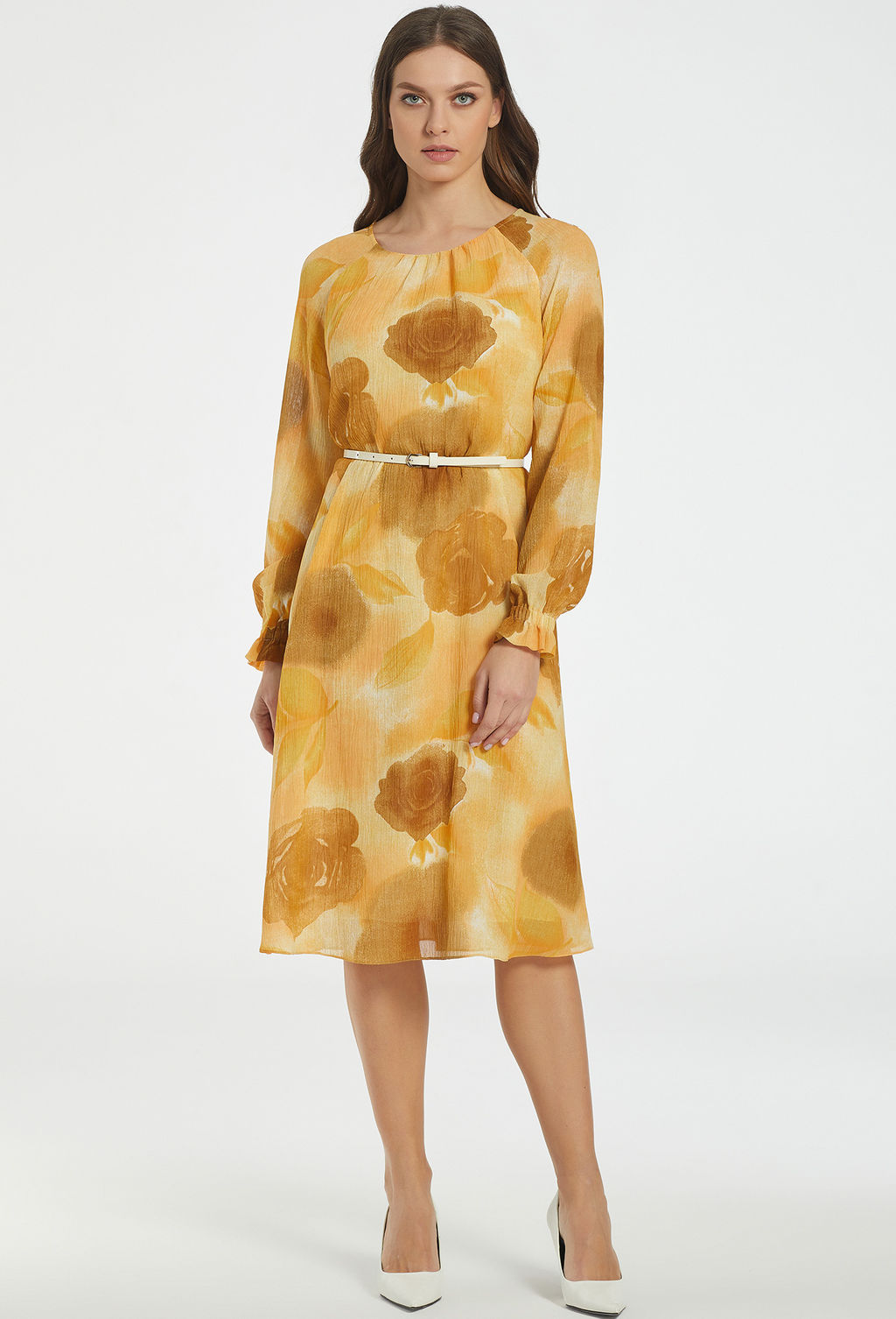 Красивое платье А-образного силуэта с округлой формой горловины и прозрачными рукавами реглан, сшили из лёгкого фактурного шифона с романтичным дизайном. Максимально женственной модель делают струящийся силуэт, сборка по низу рукавов. Для удобства в носке по спинке обработана щелевидная застёжка на навесную петлю и пуговицу. Чтобы сделать платье ещё более эффектным, линию талии подчеркнули стильным поясом-ремнём с пряжкой.