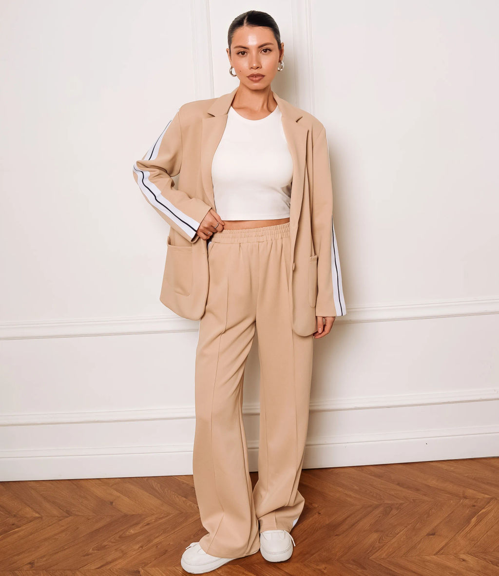 Костюм это одежда, которая подчеркивает стиль и комфорт каждой женщины. Костюм жакета свободного прямого кроя с мягкими лацканами и длинными рукавами, на каждом рукаве проходит декоративная полоска в виде двойной контрастной вставки, начинающаяся от плеча и доходящая до манжеты; нагрудная часть жакета с ровной линией плеча, застёжка на одну крупную пуговицу, две накладные карманы средней глубины расположены на уровне бёдер. Брюки свободного прямого силуэта с высокой или средней линией талии, пояс без широкого пояса. Для изготовления использованы ткани 90% полиэстер и 10% хлопок, который характеризуются отличным качеством и дышащими свойствами. Даже после множества стирок изделие не утратит первоначальной красоты. Вы будете носить его с радостью. Обратите внимание на цвет. Он полностью соответствуют фотографии на сайте. Чтобы вы были уверены в размере, мы представили на странице таблицу. Воспользовавшись ею, вы сможете сами обмерить себя и удостовериться. Установленная нами цена является приемлемой. Не откажите себе в удовольствии быть стильной и комфортной! Рост модели 164, 83-61-89. Вы можете заказать онлайн презентацию на интересующие Вас модели. Наши менеджеры свяжутся с Вами и проведут индивидуальную видеотрансляцию, помогут составить заказ и ответят на Ваши вопросы. -- Характеристики -- Цвет: бежевый Пол: Женский Страна производитель: Китай Сезон: Демисезон Материал: Хлопок, Полиэстер