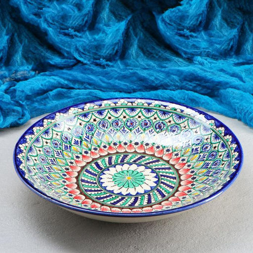 Посуда с национальной росписью станет отменным подарком для ценителей высокородной посуды.Риштан — город на востоке Узбекистана, один из древнейших в Ферганской долине. С давних времён Риштан славится своим гончарным искусством изготовления цветной керамики. Красноватую глину для изделия добывают в самом городе. Мастера утверждают, что их глина настолько высокого качества, что даже не нуждается в предварительной обработке. Дополните коллекцию кухонных аксессуаров пряными восточными нотами.Все товары производства Узбекистан. Набор: Нет. Форма: Круглая. Диаметр, см: 33. Тематика: Растительный орнамент. Тематика: Цветочно-растительная. Рисунок: Да. Крышка: Нет. Можно мыть в посудомоечной машине: Нет. Можно использовать в СВЧ-печи: Да. Особенности: Глазурованные. Бесплатная доставка: Да. Примечание: Ручная работа, рисунок может отличаться от фото. Примечание: Изделие нельзя мыть в посудомоечной машине.