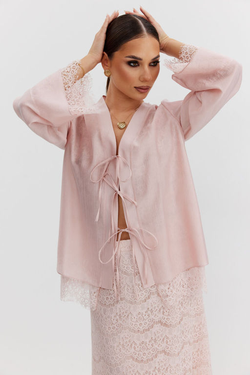 Блузка женская свободного силуэта, из полупрозрачной вуали. Спинка и перед на кружевной подкладке. Застежка на планку с тремя завязками. Рукав втачной длинный расширенный книзу, по низу рукава кружевная широкая манжета, имитирующая многослойность.