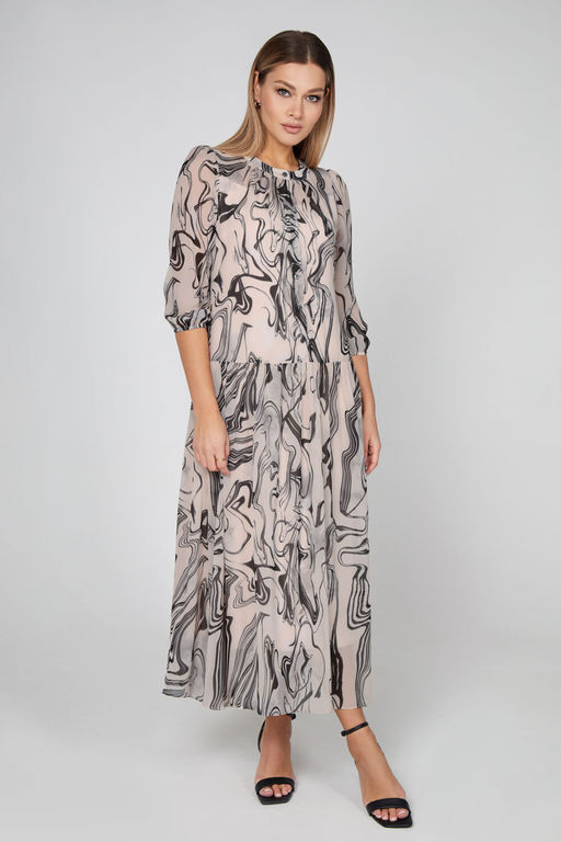 Современное и женственное! Это струящееся свободное платье длины макси из польского шифона с щедро расклешенной юбкой обладает очаровательной легкостью. Вместе с интересным абстрактным принтом оно придает особый дух, подчеркивающий Вашу индивидуальность. Модель, с центральной застёжкой на петли и пуговицы, декоративной планкой по горловине со сборкой по переду и укороченными полупрозрачными рукавами, сосбореными по низу эластичной тесьмой и дополненные небольшой сборкой по окату, имеет подкладку из вискозы, благодаря которой Вы будете чувствовать себя комфортно. Идеально подходит для модных образов!­