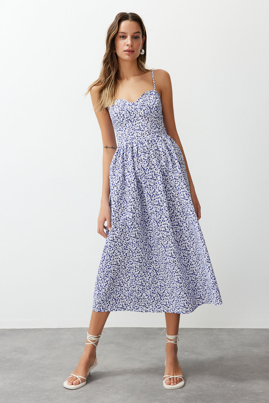 • Mavi Cicek Desenli A Kesim Kalp Yaka Maxi Poplin Dokuma Elbise TWOSS24EL00700