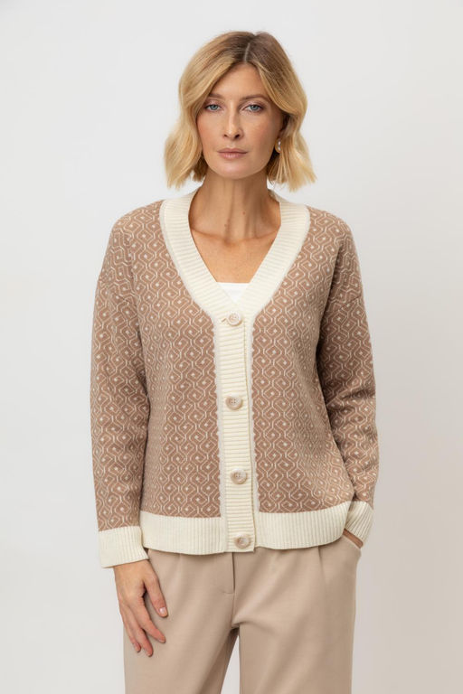 Вязаный кардиган на пуговицах из шерсти с добавлением акрила. Связан жаккардом, а манжеты и нижний край не растянутся благодаря вывязанной резинке. Шерсть мериноса в составе сохраняет тепло, акрил делает изделие мягким. Прямой силуэт идеально подходит как к юбке, так и к брюкам.