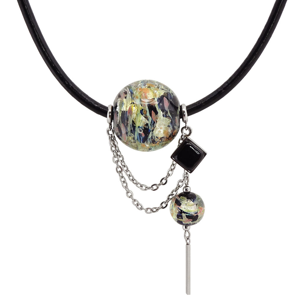 Колье изготовлено из натуральной кожи, муранского стекла и гипоаллергенной ювелирной стали, что очень важно для людей с чувствительной кожей. Металл не темнеет и не подвергается воздействиям окружающей среды, надолго обеспечивая красивый внешний вид изделия. Длина колье - 46 см + 5 см. удлиняющая цепочка. Диаметр стеклянных шаров - 1,2, 1,5 и 2,5 см. Вес -  38 гр.­