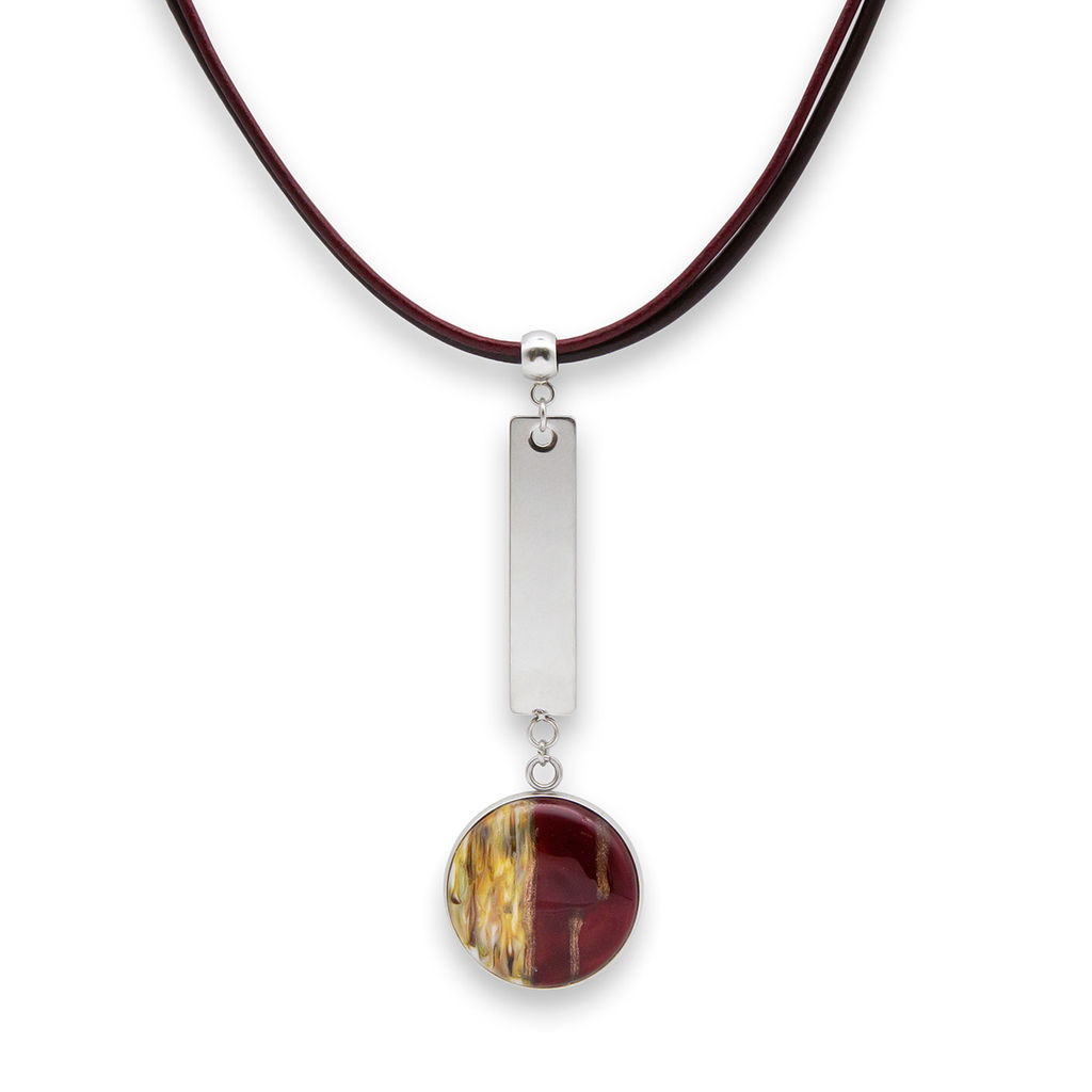 Колье изготовлено из натуральной кожи, муранского стекла и гипоаллергенной ювелирной стали, что очень важно для людей с чувствительной кожей. Металл не темнеет и не подвергается воздействиям окружающей среды, надолго обеспечивая красивый внешний вид изделия.  Длина колье - 46 см + 5 см. удлиняющая цепочка. Длина кулона - 7 см. Диаметр стеклянного элемента - 2,5 см.  Вес - 16 гр.­