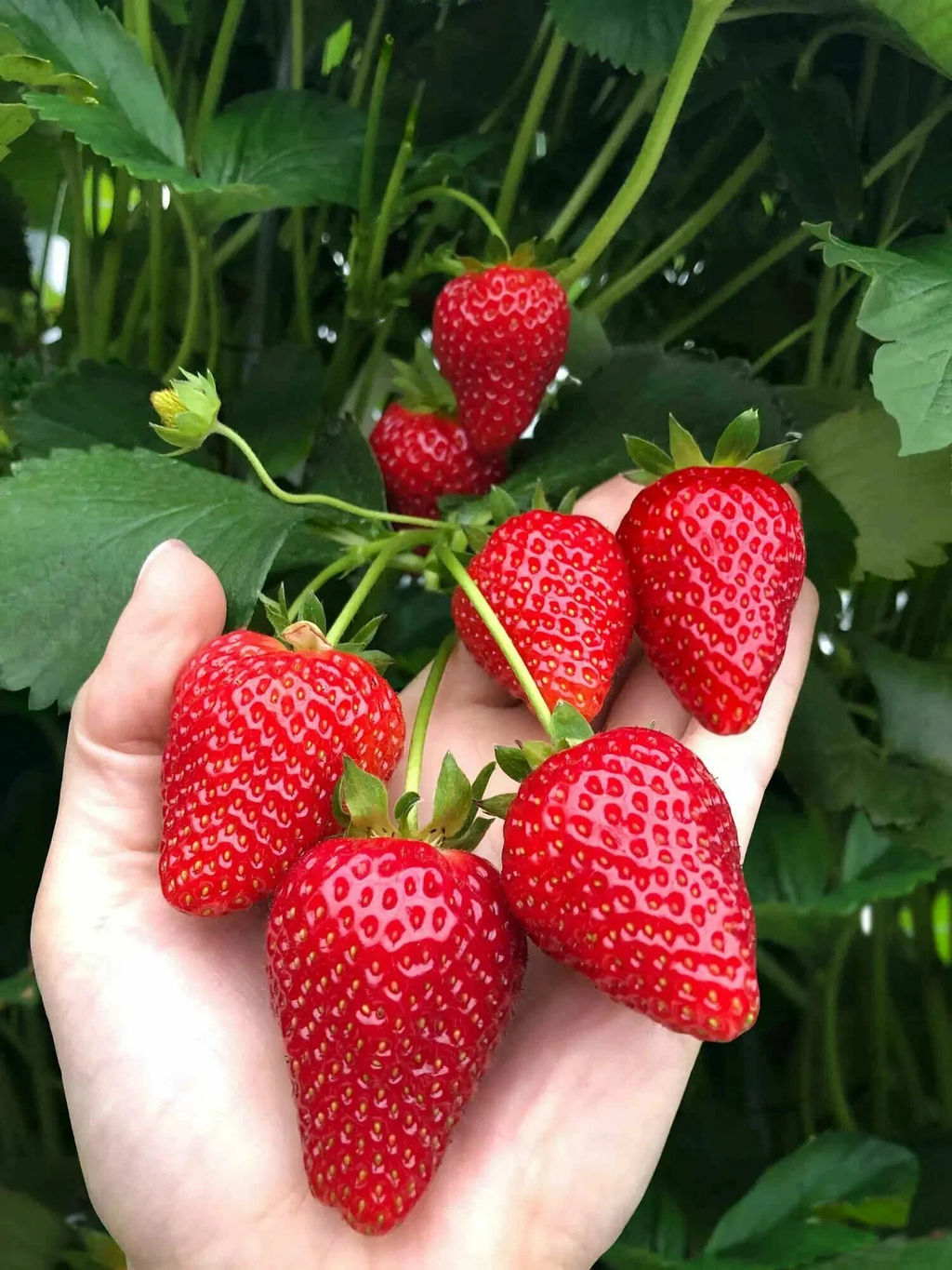 Плоды крупные, весом от 20 до 40 г, но встречаются и экземпляры в 90 г. Ягоды похожи на приплюснутый конус и имеют ярко-красный цвет. Вкус гармоничный, кисло-сладкий, с нотками земляники.