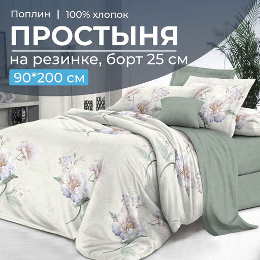 Артикул: Простыня на резинке 090*200 см, поплин, борт 25 см (Шаганэ (компаньон))