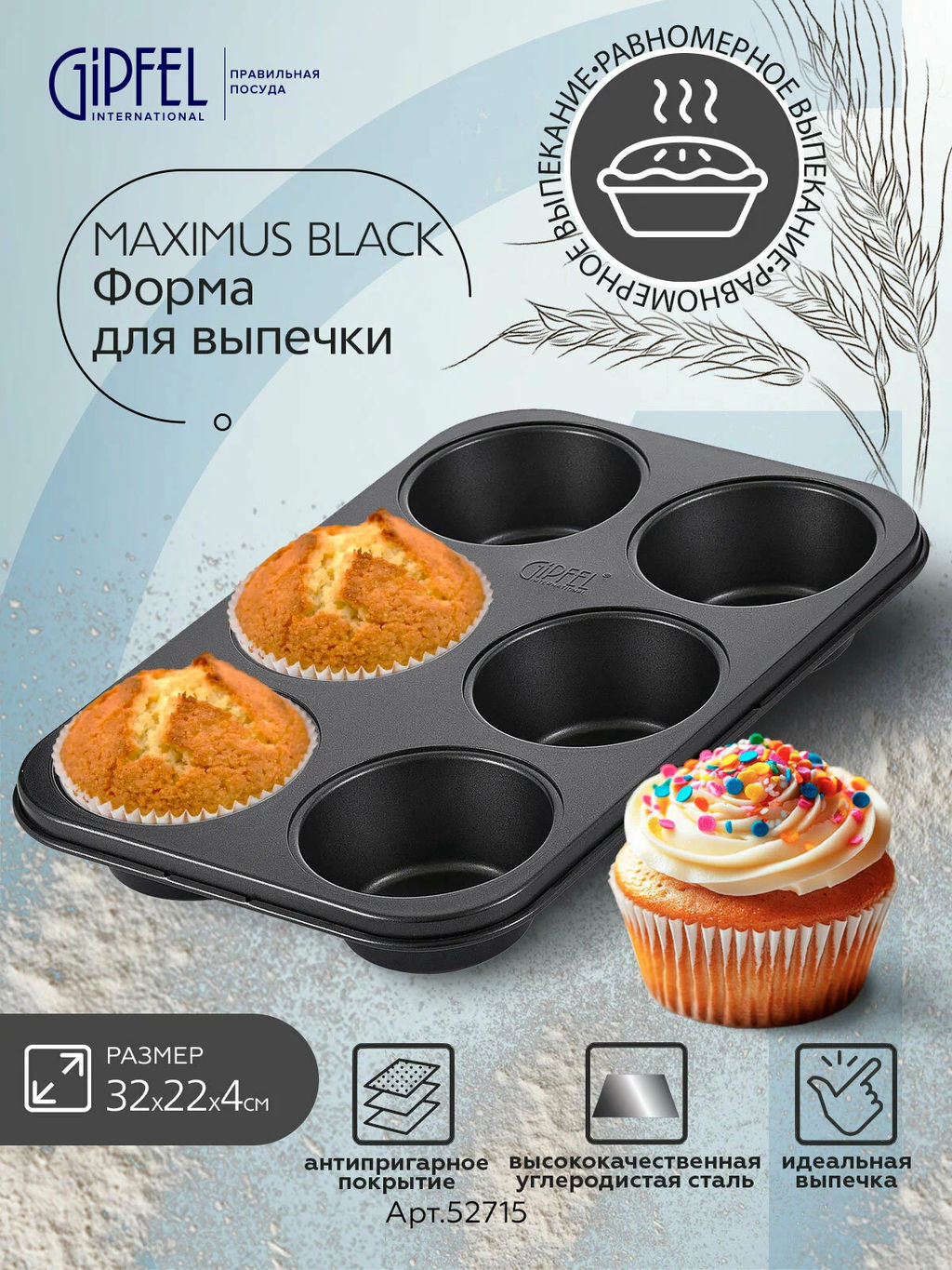 52715 GIPFEL Форма для выпечки маффинов MAXIMUS BLACK 32x22x4см/6шт с двуслойным антипригарным покрытием Whitford Quantanium. Толщина: 0,7мм. Материал: углеродистая сталь. Цвет: чёрный.