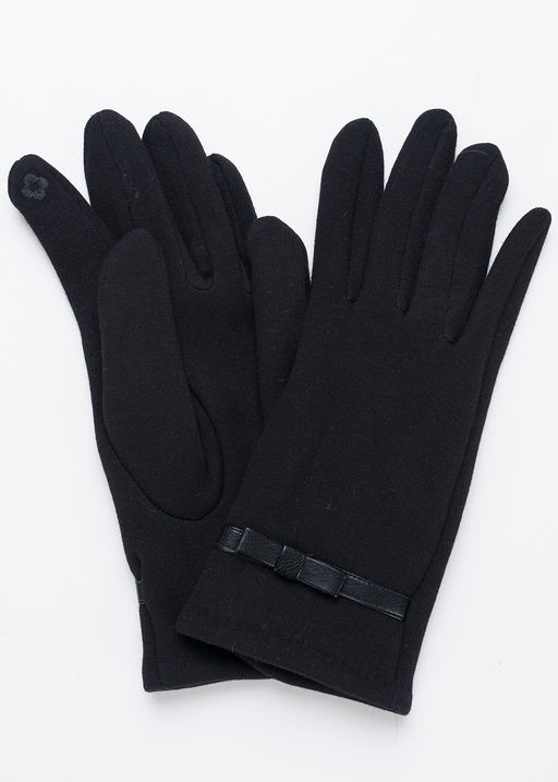 Женские перчатки из трикотажного полотна имитирующего внутри искусственный мех, декорированы кожанным ремешком на запястье, на большом и указательном пальцах вышивка сенсорными нитками, размер 18. 60% пэ, 35% хлопок, 5% эластан