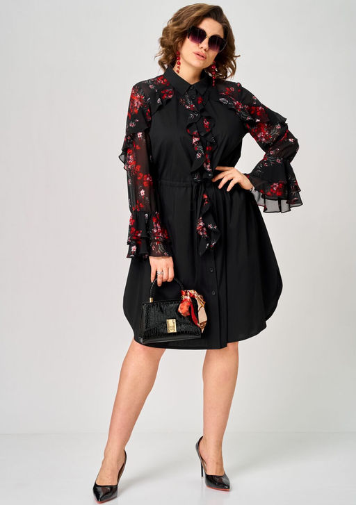 Платье женское шикарное стильное нарядно повседневное прямого силуэта. Выполнено из хорошего хлопка в сочетании с красивым легким воздушным принтованным шифоном. Вырез горловины вортник на стойке рубашечного типа, застежка доверху на обметанные петли и пуговицы, что дает возможность регулировать глубину декальте. Рукав втачной по низу на притачной манжете из двух воланов. По талии втянута кулиса с помощью которой регулируется желаемый размер талии и скрадываются все недостатки. Низ платья в стильном современном дизайне - фигурный. В боковых швах обработаны небольшие разрезы. Декором платья служат очень красивые воланы из шифона.­