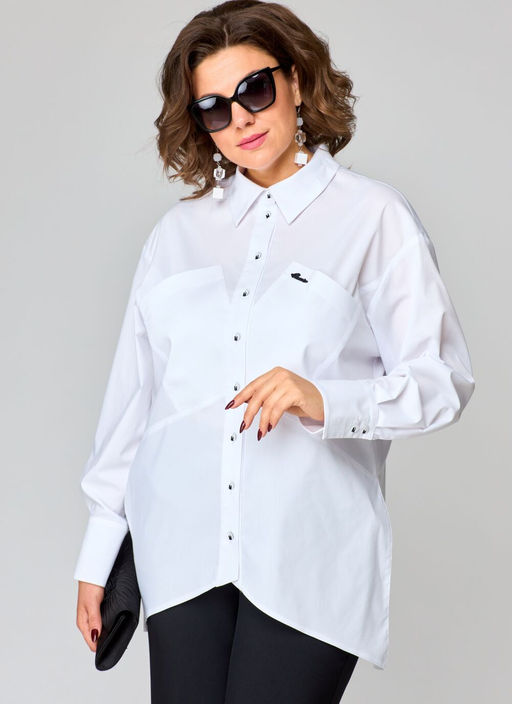 Блуза женская повседневная прямого силуэта с фигурным низом выполнена из хлопка. Вырез горловины воротник на стойке рубашечного типа, застежка доверх на обметанные петли и пговицы. Рукав спущенный, втаной на притачной манете, в боковых швах обработаны разрезы. На полочках два накладных кармана. по спинке фигурная кокетка и встречная складка. декором служат отделочные элементы, декоративные пуговицы и металличека лейба на кармане.­