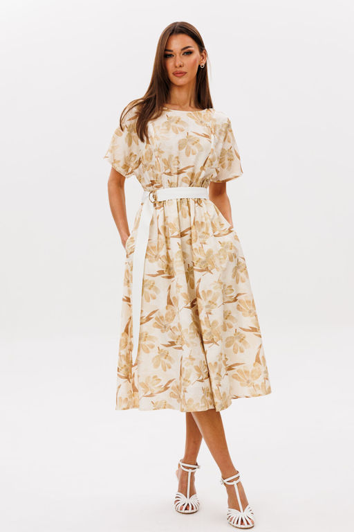 Состав: Вискоза-55%; ПЭ-30%; Лён-15%; Элегантное платье с роскошным принтом и удачной посадкой на фигуре. Платье отрезное по линии талии, округлой горловиной. Полочка состоит из центральной детали и вертикальных рельефных бочков, переходящих в цельнокроеные рукава укороченной длины. Длина рукава по плечевому шву от края горловины 31 см. Спинка с цельнокроеным укороченным рукавом летучая мышь имеет средний шов, в котором расположен у горловины разрез с пуговицей-застежкой. Юбка платья А-силуэта, состоящая из цельной детали спереди, сзади: средний шов. В боковых швах платья: внутренние карманы. Лиф платья с юбкой платья соединен швом, в который вставлена эластичная тесьма шириной 1 см. Юбка платья на подкладке. Длина платья по среднему шву спинки 113-115см (в зависимости от размерного ряда). Длина юбки платья от линии талии 78-82 см. Платье дополнено съемным текстильным поясом на пряжке. Представленная фурнитура может отличаться от представленной на фото/видео материале. Особые рекомендации: рекомендуется холодная деликатная ручная стирка, без использования отбеливающих СМС, без интенсивного трения. Сушка в вертикальном положении. ВТО с минимальным паром. -- Характеристики -- Состав: Вискоза-55%; ПЭ-30%; Лён-15%; Сезон: Лето Рост: 164 Страна бренда: Беларусь