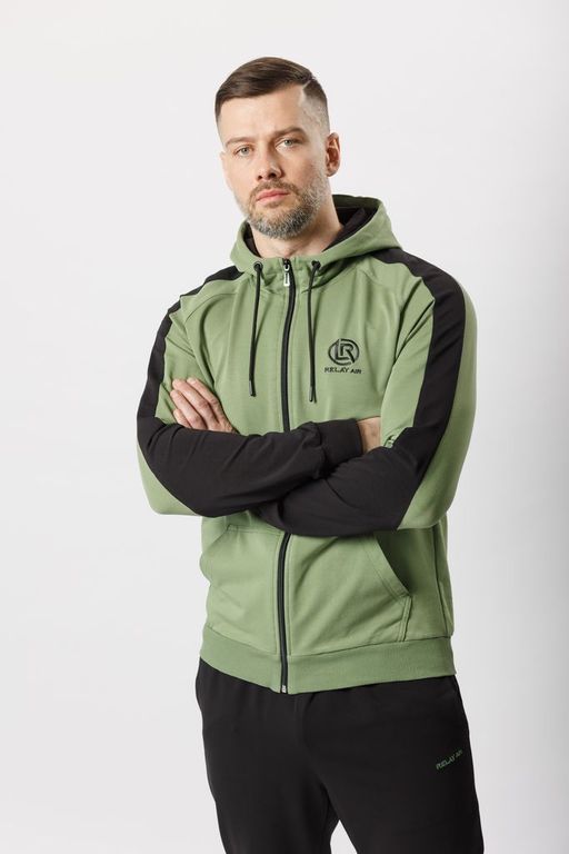 Верх - толстовка на молнии с капюшоном с высокой стойкой. На груди — классический карман «кенгуру». Рукав реглан создаёт спортивный силуэт и не сковывает движений, а контрастные вставки вдоль рукавов придают образу динамику. Манжеты на рукавах и по низу изделия помогают сохранить форму и обеспечивают комфорт при движении.