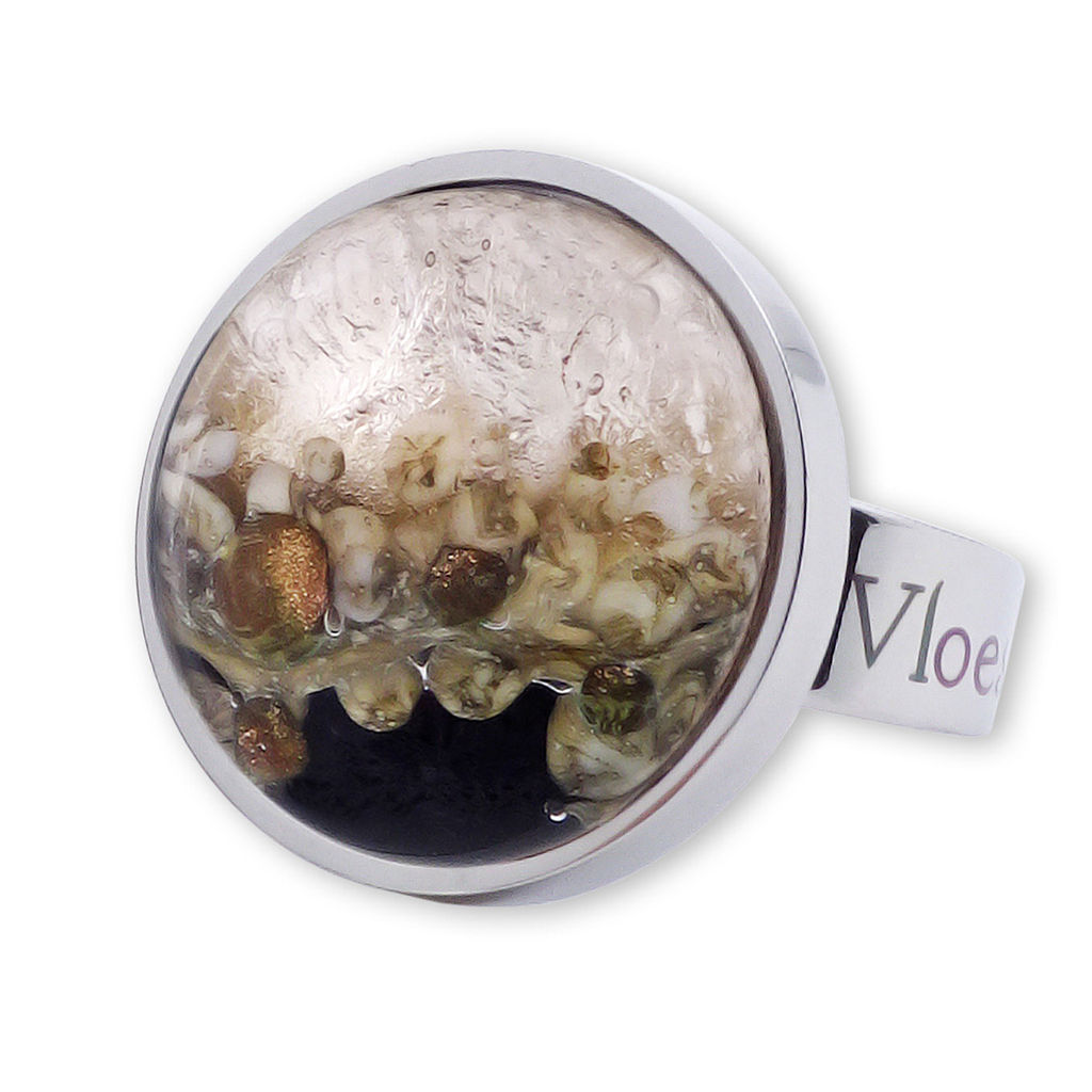 Кольцо изготовлено из муранского стекла и гипоаллергенной ювелирной стали, что очень важно для людей с чувствительной кожей. Металл не темнеет и не подвергается воздействиям окружающей среды, надолго обеспечивая красивый внешний вид изделия. Диаметр стеклянного элемента - 2 см. Кольцо безразмерное, регулируется с 16 до 19 размера. Вес - 8 гр.