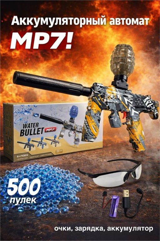 • Стреляющ. гидропулями аккумул. 41*30,5см автомат "MP7 песочно-серый" (916-2) с глушителем; 500 пулек, USB зарядка и очки, в коробке