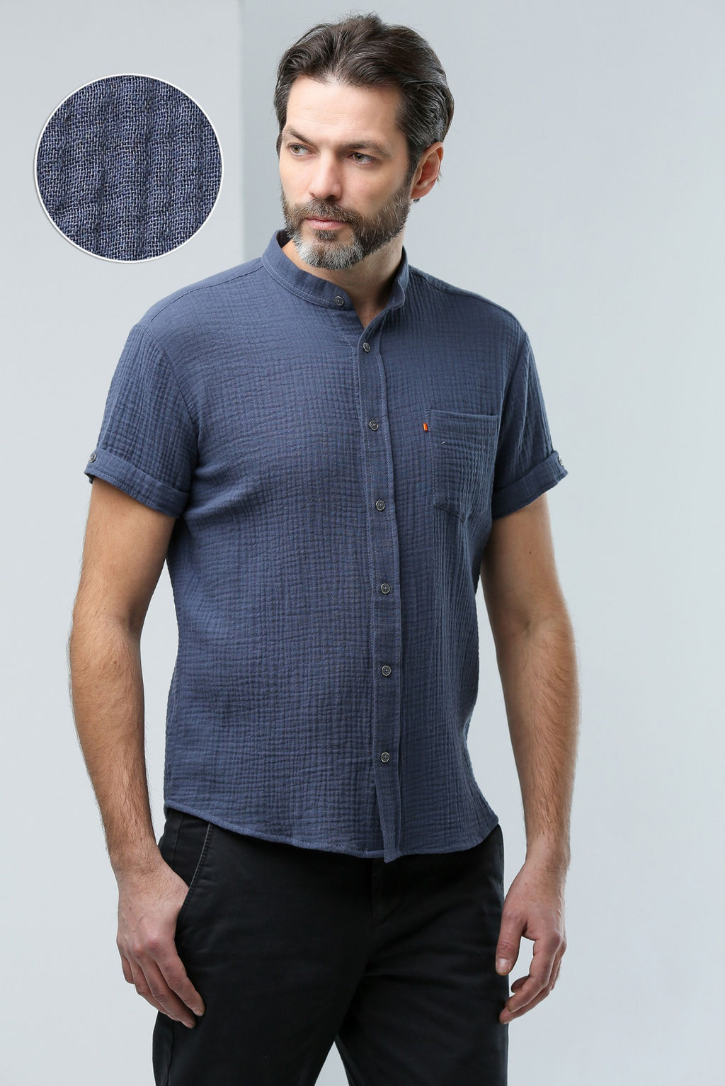 Рубашка прямого силуэта из двухслойной жатой ткани темно-синего цвета. Ультра модный воротник стойка, накладной карман с декоративной отделкой. 100% хлопок! Не мнется, быстро сохнет, легкая и комфортная модель для отдыха и городского стиля кэжуал.