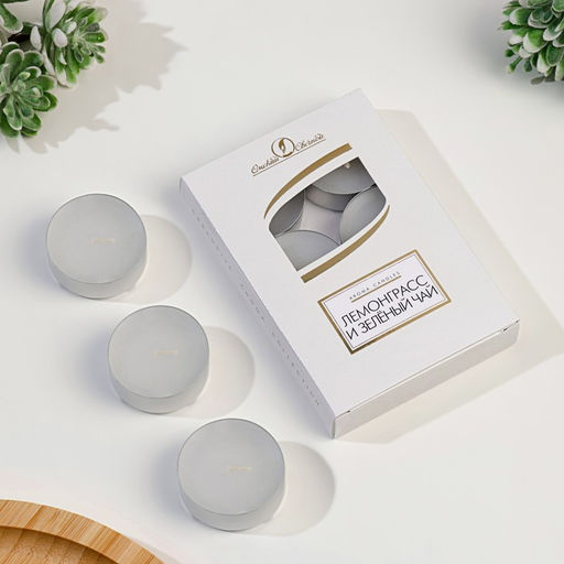 Набор: Да. Ширина, см: 3.8. Высота свечи, см: 1.6. В наборе, шт.: 6. Вес, г: 12. Форма свечи: Гильза. Ароматизированные: Да. Аромат: Лемонграсс. Аромат: Зелёный чай. Бесплатная доставка: Да.