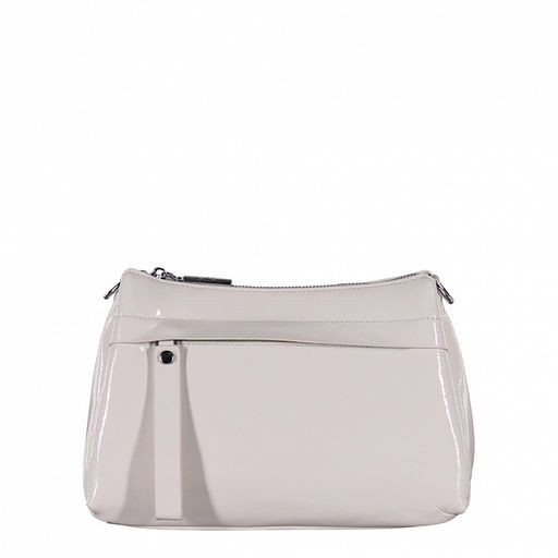 Сумка среднего размера, выполнена из натуральной лаковой кожи.  Декорирована брелоком на "собачке". Дополнена серебристой фурнитурой. Данная модель закрывается на молнию. Каркас полужесткий. Носится в руке или на плече. В комплекте съемный ремень с регулировкой длины и удлиненная ручка.