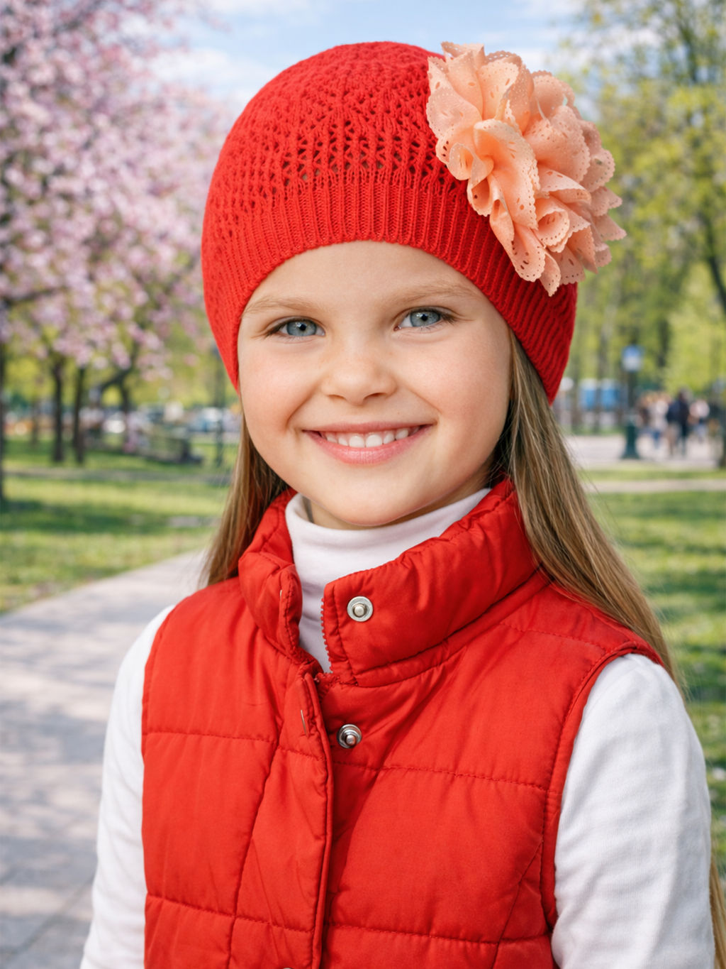 Легкая вязаная шапочка для девочки однотонного цвета на лето. Сделана из легкого акрила воздушным ажурным узором. Сбоку большой фактурный цветок контрастного цвета.